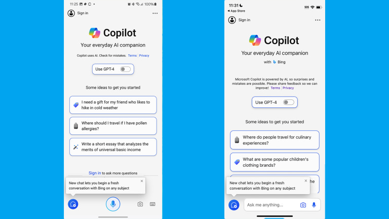 Alegerea modelelor AI: În aplicația mobilă Copilot, puteți selecta GPT-3.5 (mai rapid) sau GPT-4 (mai precis) pentru a alimenta conversațiile. Abonații Copilot Pro pot alege GPT-4 Turbo pentru răspunsuri și mai rapide și mai precise.